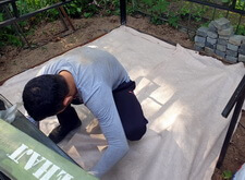 Для того, чтобы предотвратить произрастание травы в швах между плитками, мы уложили на территории участка геотекстиль, который затем засыпали пескобетонной смесью.