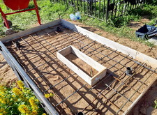 Далее выставляем опалубку, определяем место под цветник. Внутрь участка закладываем частую арматурную сетку. Там, где это возможно, привариваем её к сваям.